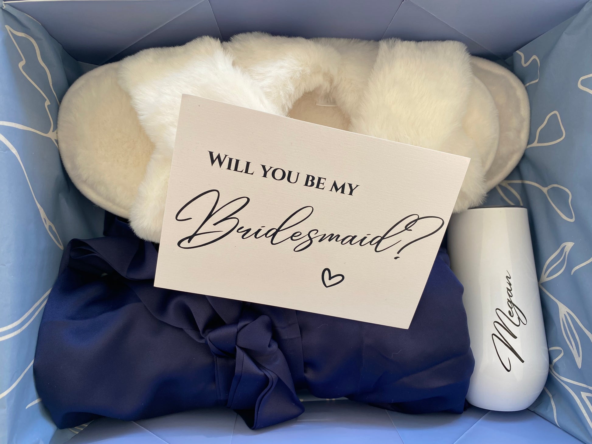 Our LUXE Bridesmaid Proposal Gift Box features our stunning bridesmaid robe, soft white slippers, a champagne tumbler (can be personalised with a name, please leave a note at checkout), and a Bridesmaid/Maid of Honour proposal card.