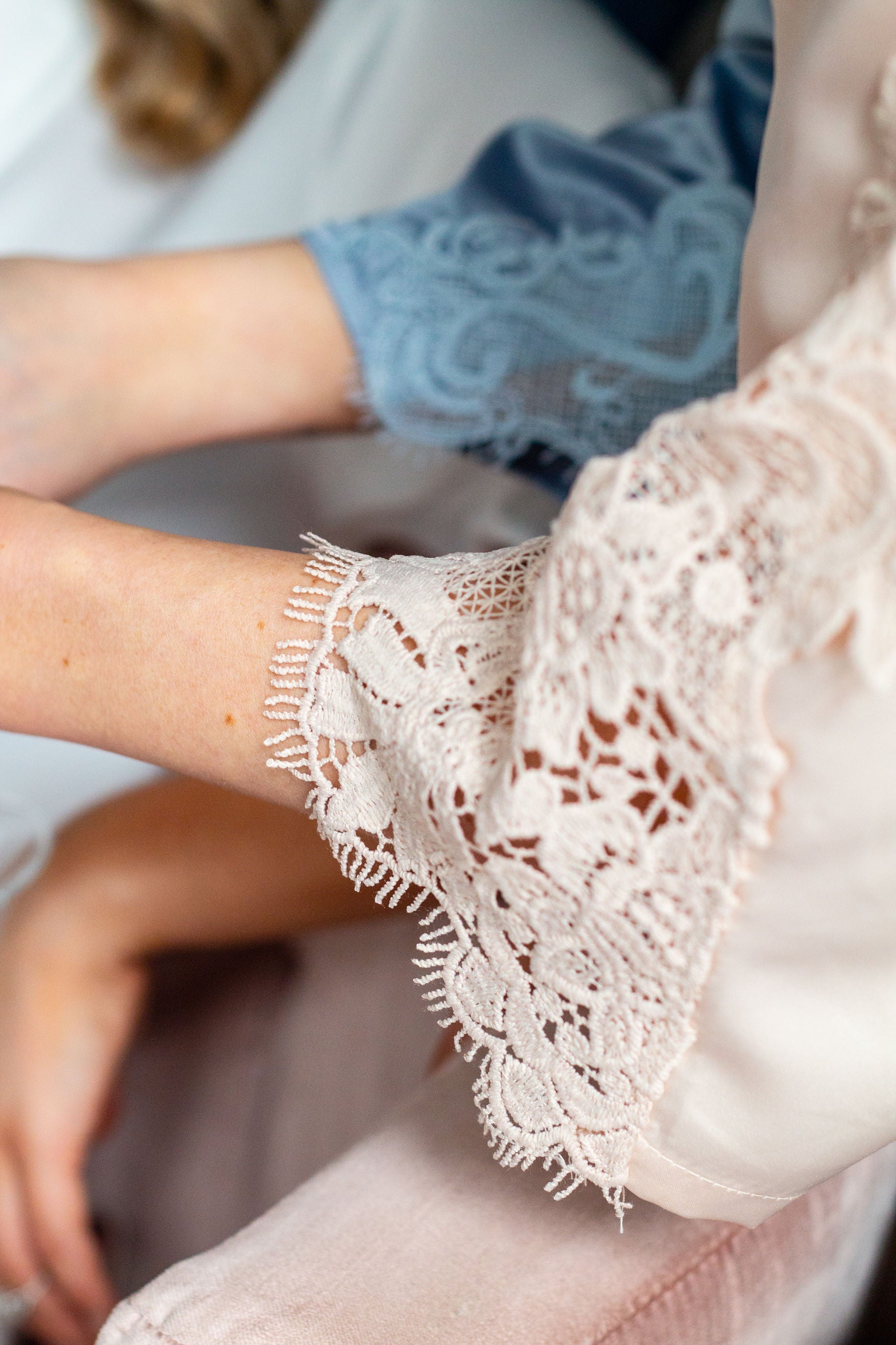 Our luxurious bridesmaids robes are made from soft satin with delicate lace trim detailing on the sleeves and hem. Available in five beautiful colours: White, Dusky Pink, Champagne, Dusky Blue, and Navy.